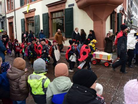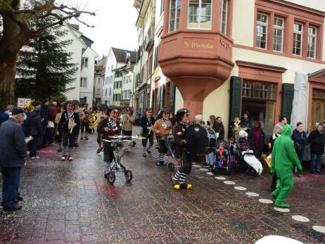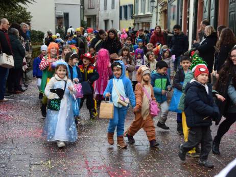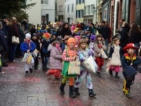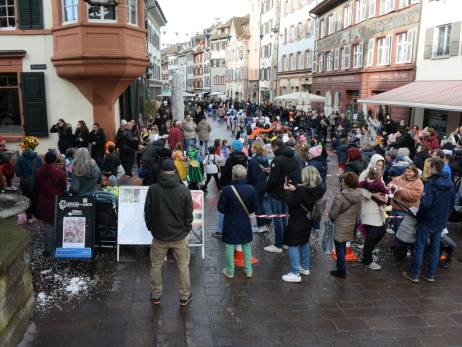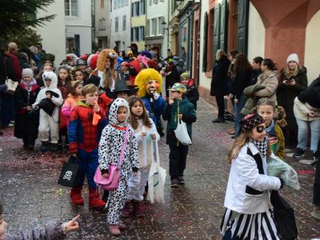 Pünktlich vor Umzugsbeginn hat es aufgehört zu regnen und zwischendurch zeigte sich sogar die Sonne. Die Freude war riesig; strahlende Gesichter, wohin man auch schaute. Ob mit selbstgebastelten Kostümen oder "Charivari" bunt gemischt machten sich die Schulkinder, musikalisch begleitet von allen Guggenformationen in Rheinfelden, auf die Route, welche von der Bahnhofstrasse über die Brodlaube und Marktgasse, nach einer extra Schlaufe durch die Rindergasse, wieder auf den Hauptwachplatz führte. Zahlreiche Zuschauerinnen und Zuschauer freuten sich ab dem bunten Kinderumzug.