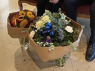 Franco Mazzi, Stadtammann, unterstützt durch Nicolás Schmid, Leiter Stadtmarketing, und Rathausweibel Marcel Hauri überbrachten die offiziellen Grüsse im Namen des Stadtrats und des Regierungsrats. Als Zeichen der Wertschätzung erhielt Herr Erdmann zwei grosse Blumensträusse in den Farben von Stadt und Kanton sowie eine Kopie seines Heimatscheins. Hans Erdmann ist mit 100 Jahren der älteste Rheinfelder Einwohner und Franco Mazzi führte aus, dass "diese Gratulation aussergewöhnlich ist, da Hans Erdmann während meiner 20-jährigen Amtszeit der erste Mann ist, welchem ich zum 100. Geburtstag gratulieren darf. Es ist schön zu sehen, wie vital und geistig aktiv Hans Erdmann ist."